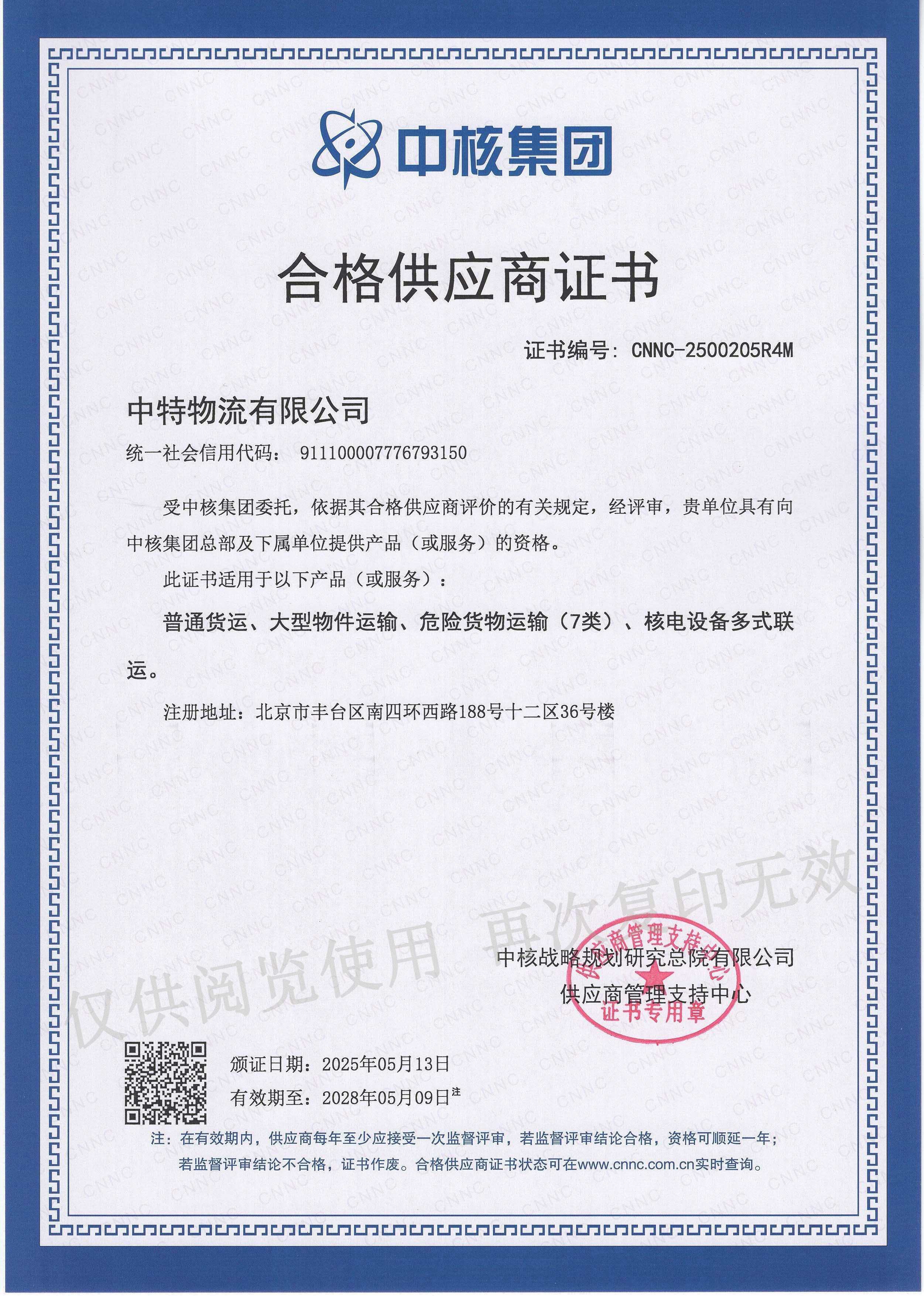 中核合格供應(yīng)商證書